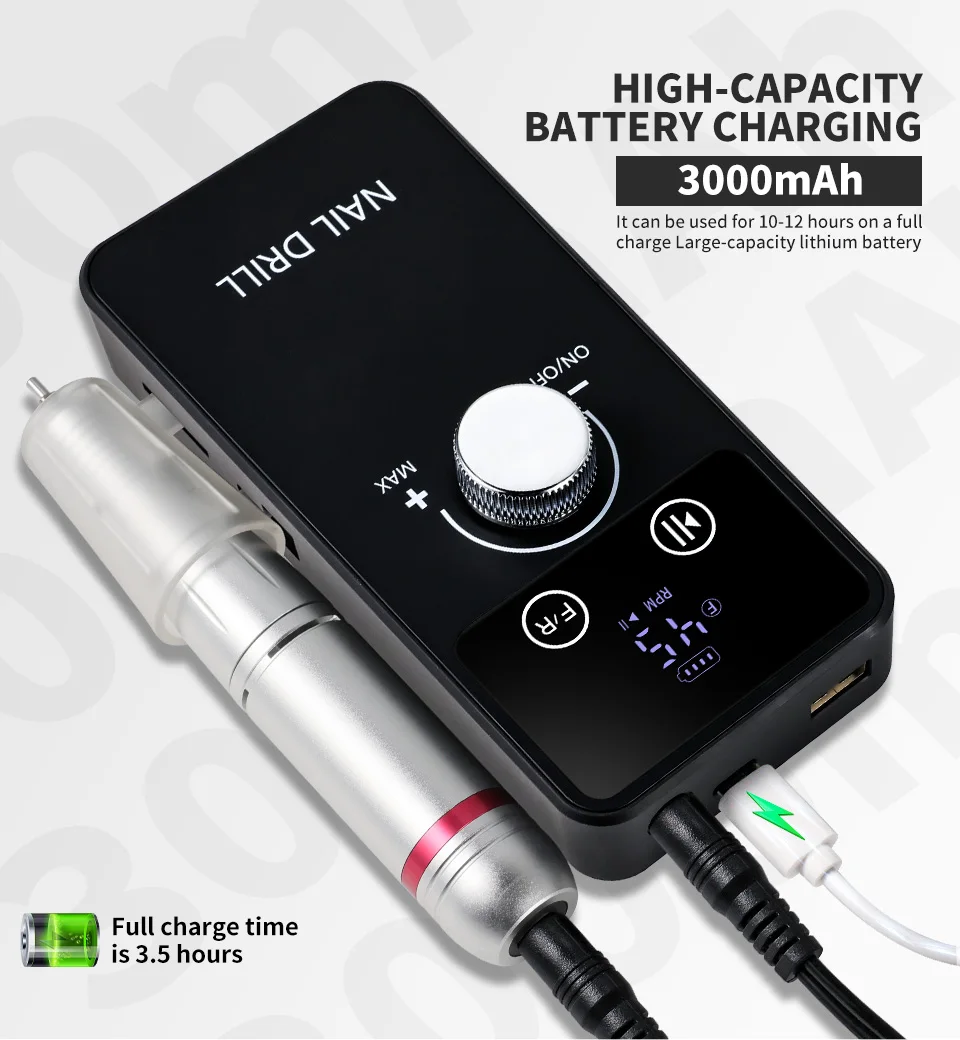 【 Maximum speed 45000RPM】: The rechargeable nail drill matched with a mobile power supply can work for up to 10 hours after being fully charged for 2 hours.