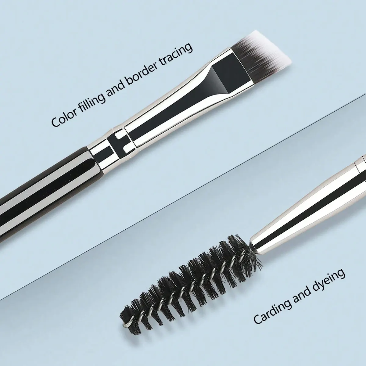 Precision dual-ended brush with angled tip and spoolie for shaping, defining, and grooming brows and lashes. Soft wool fiber bristles ensure smooth, controlled application.