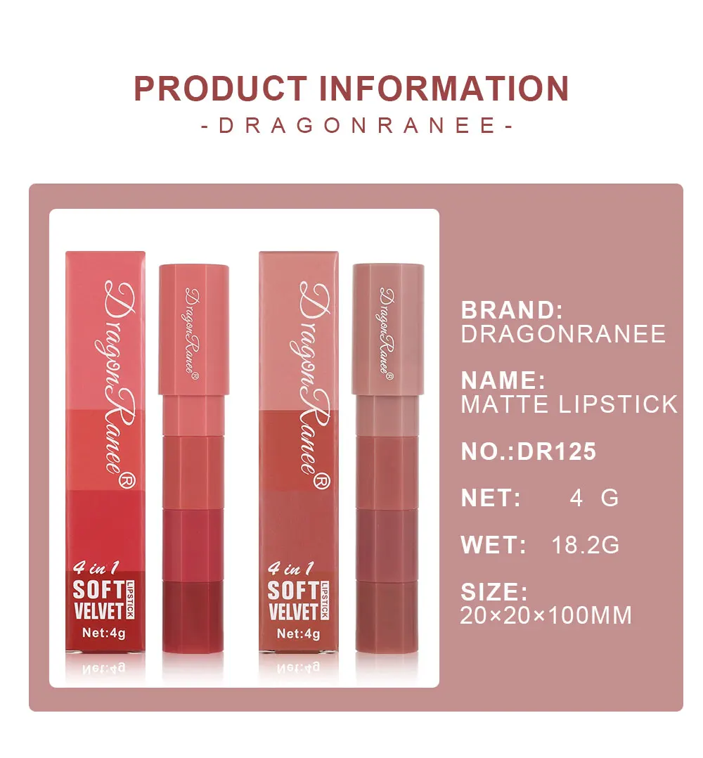 This Mini 4-Color Matte Lipstick Pen by Dragon Ranee delivers rich, highly pigmented color with a smooth, velvet finish. Moisturizing and easy to apply, it provides long-lasting wear without transferring. Compact and versatile, it’s perfect for on-the-go touch-ups and creating a variety of lip looks.