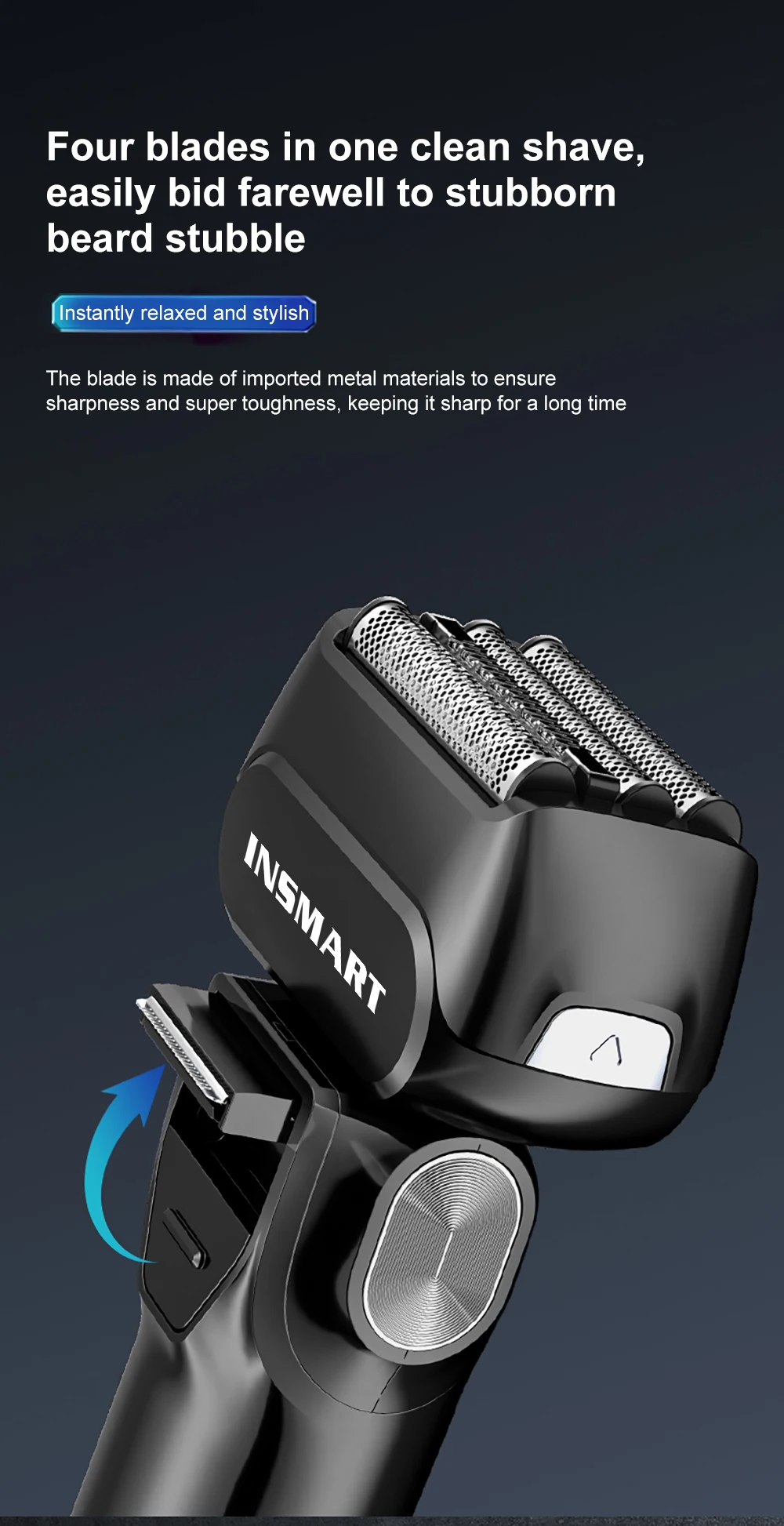 【4-Blade System】 - Precision Trimming for Difficult Areas Equipped with 2 contoured outer blades and a 30° acute-angle inner blade, our men's electric shavers' triangular head configuration efficiently tackles stubborn neck and jawline hair. Independent floating blades adapt to various facial contours.