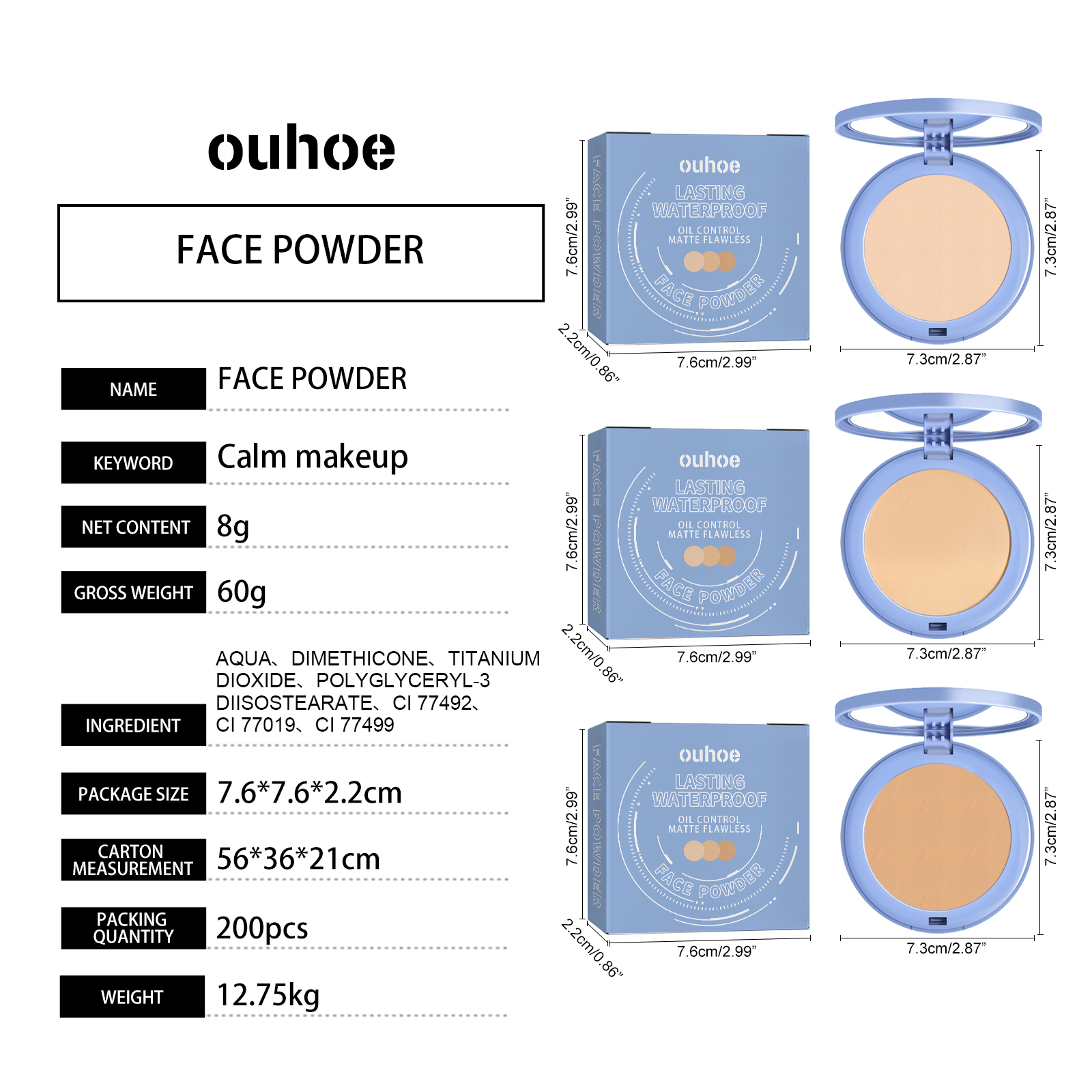 Our setting powder contains niacinamide, lavender extract and mica. It can be delicate and smooth, perfect makeup function, not afraid of wearing a mask, and excellent waterproof performance. Its use is very simple: when using it, you can use the powder puff that comes with the powder, fold the powder puff in half and dip it in powder, and gently press it to make it dipped in powder more evenly. Then gently press the powder puff on the face skin, and press to fix the makeup. And it can set makeup and touch up makeup.